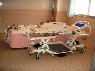 また訓練施設の廊下を進むと、全介助の方でも寝たまま楽に入浴できるお風呂場(写真6)